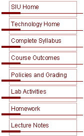 SIU Home | Technology Home | Complete Course Syllabus | ET 332a Intro Course Outcomes | Policies and Grading | Lab Activities | Homework | Lecture Notes