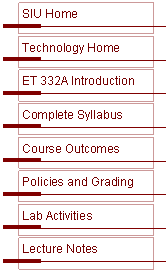 SIU Home | Technology Home | Complete Course Syllabus | ET 332a Intro Course Outcomes | Policies and Grading | Lab Activities | Homework | Lecture Notes