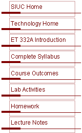 SIU Home | Technology Home | Complete Course Syllabus | ET 332a Intro Course Outcomes | Policies and Grading | Lab Activities | Homework | Lecture Notes